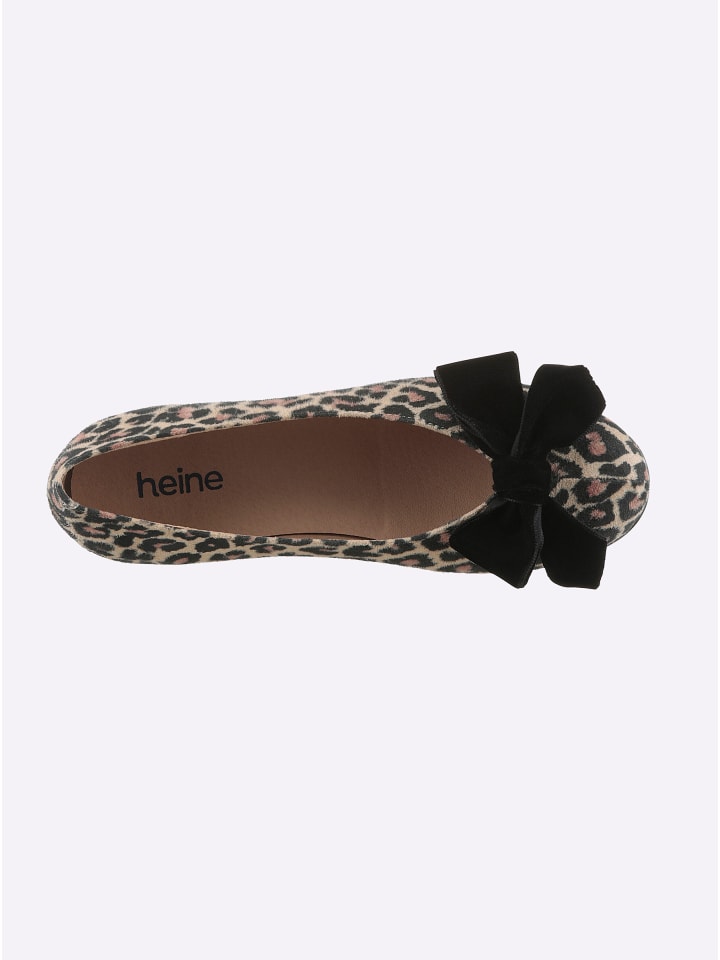 Балетки, произведенные в Испании. Изготовлены из приятного текстиля. С интересным анималистичным принтом и декоративным бантом. Блочный каблук высотой около 20 мм.