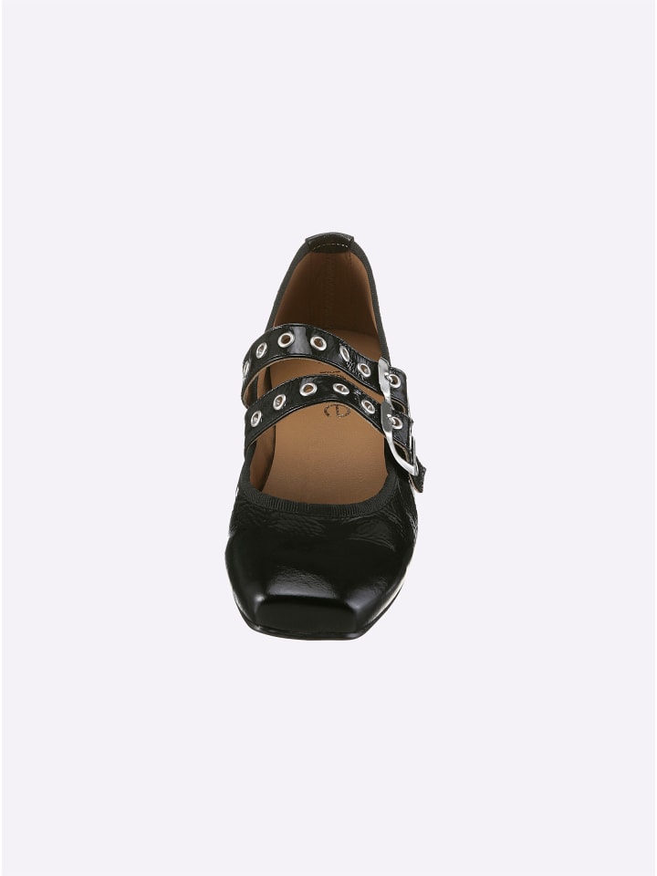 Балетки, сделанные в Испании. Лакированная воловья кожа с эффектным мятым эффектом. Модные ремешки с заклепками. Текстильная подкладка. Кожаная стелька. Каблук-бочка высотой около 10 мм.