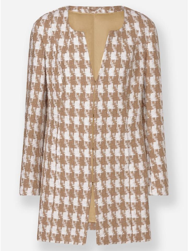 Длинный блейзер. Великолепный фасон с классическим узором гусиная лапка. Круглый вырез. С незаметной застежкой на крючок. Формирующие разделительные швы. Длинные рукава с небольшим разрезом. Карманы в швах.