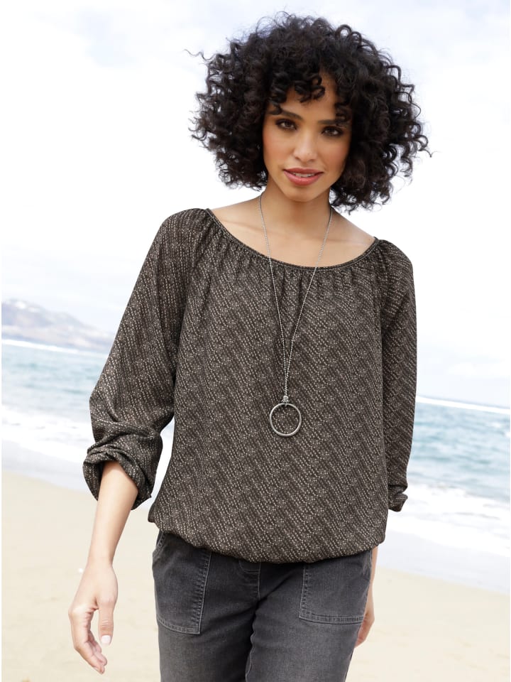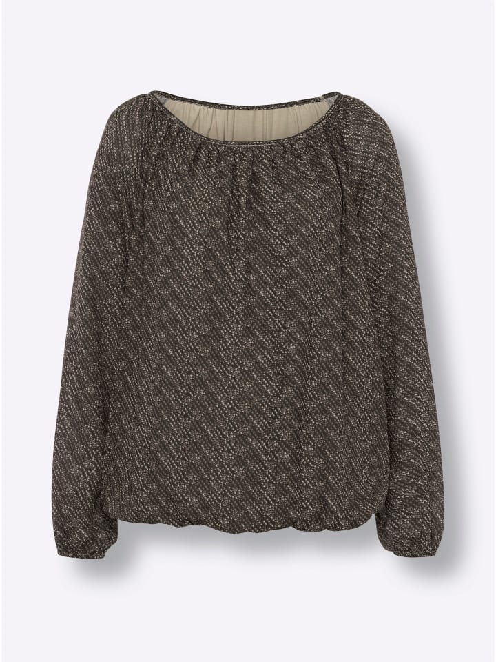 Блузка с принтом из струящейся, слегка прозрачной ткани с эксклюзивным дизайном. Широкий круглый вырез и длинные рукава реглан. Эластичные манжеты на рукавах и подоле создают красивую драпировку. Подкладка из плотной ткани. Изготовлена из переработанного полиэстера.