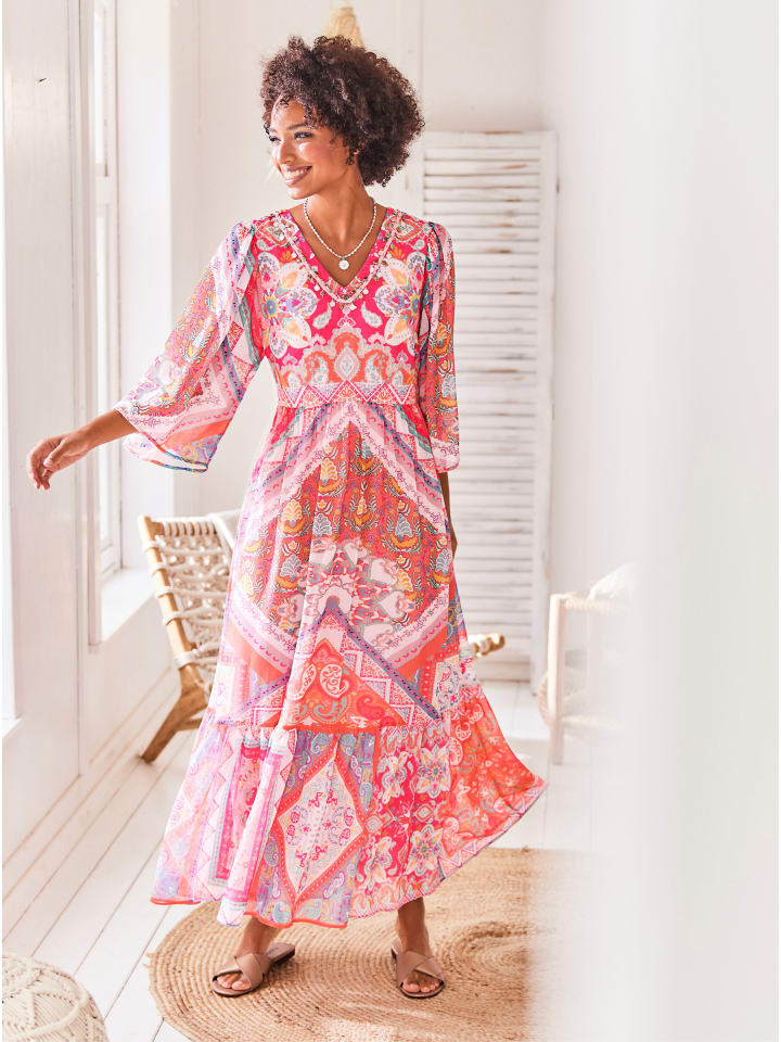 Платье с принтом модной длины макси, с изысканной отделкой и декоративной аппликацией на V-образном вырезе. Широкие рукава длиной 3/4 и застежка-молния сбоку.