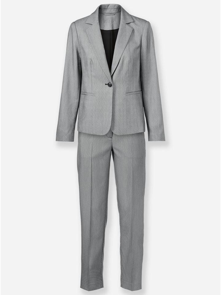 Брючный костюм: вне времени, повседневный и шикарный! Однобортный пиджак с отложным воротником и венскими швами. Застежка на одну пуговицу и два накладных кармана. Длина около 62 см. Брюки с классической посадкой, классический крой. Заглаженные складки и два боковых кармана. Два ложных кармана сзади. Изготовлено из переработанного полиэстера.