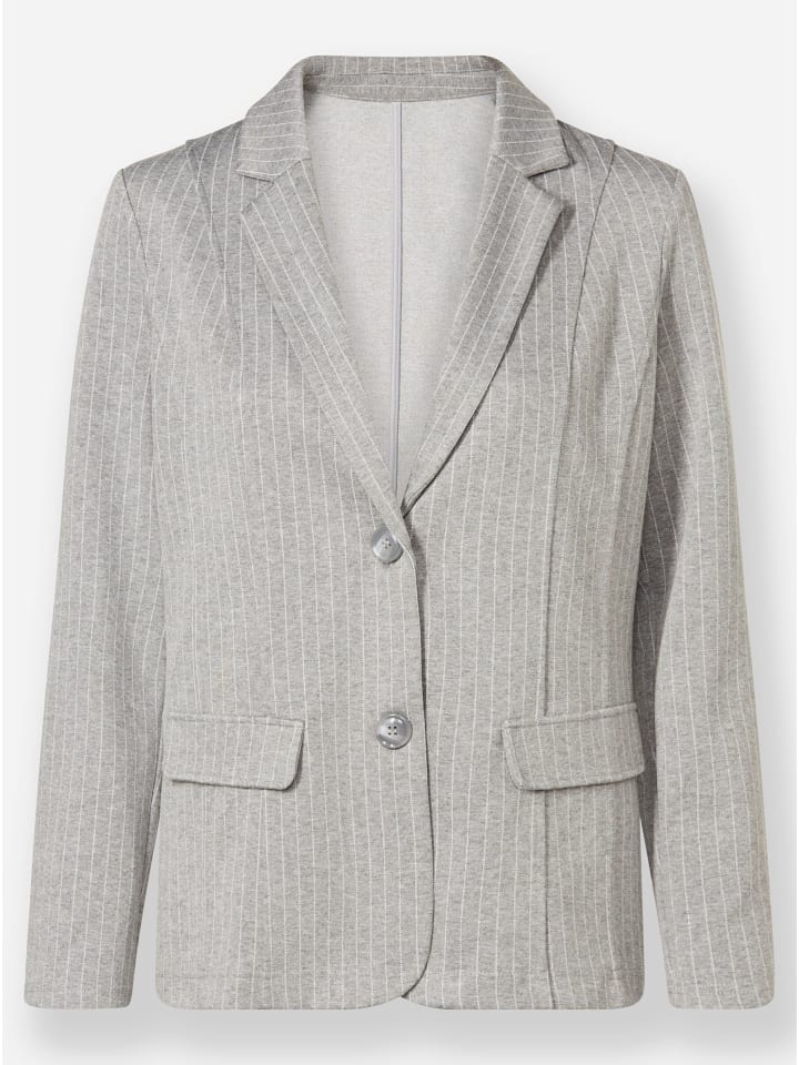 Брючный костюм. Удобный трикотажный материал с модными тонкими полосками. Блейзер с модным воротником с лацканами. Длинные рукава. Однобортная застежка на пуговицы. С декоративными клапанами. Длина около 66 см. Брюки в актуальном стиле джоггеров со складками и поясом на резинке по всему периметру со шнурком. Боковые карманы и ложные карманы сзади. Стандартная посадка.