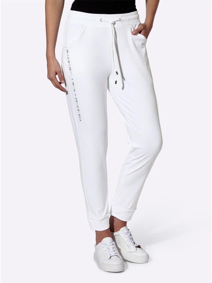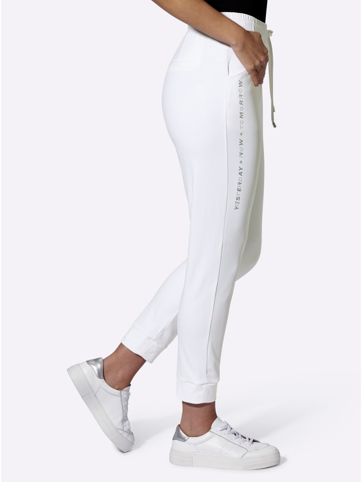 Трикотажные брюки-джоггеры с надписью и стразами по ноге. Эластичный пояс по всему периметру со шнурком. Стандартная посадка. Комфортный крой. С боковыми карманами, одним карманом на молнии и ложными карманами сзади. Ширина до щиколотки примерно 32 см.
