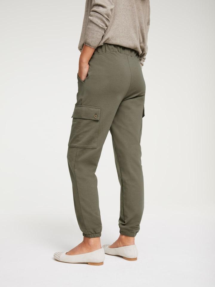 Спортивные брюки свободного кроя морковка и модной длины 7/8. С накладными карманами. Трикотажный фасон, не требующий особого ухода, со спортивным дизайном. Ширина щиколотки примерно 29 см.