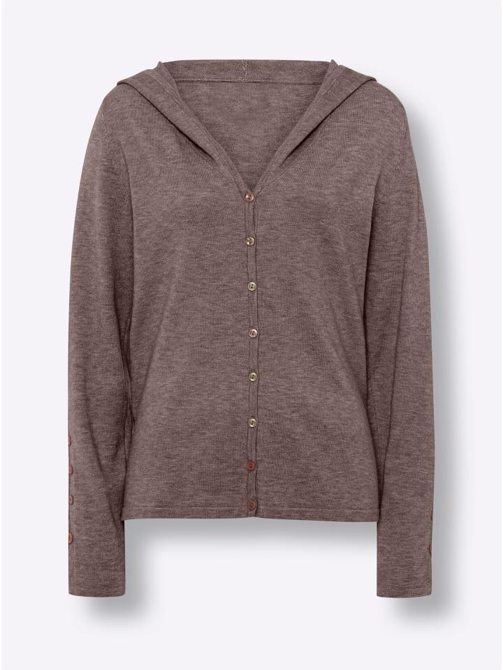 Повседневный кардиган из мягкой, струящейся тонкой вязки со спортивным капюшоном. V-образный вырез с планкой на пуговицах. Длинные рукава с декоративной планкой на пуговицах и небольшими разрезами.