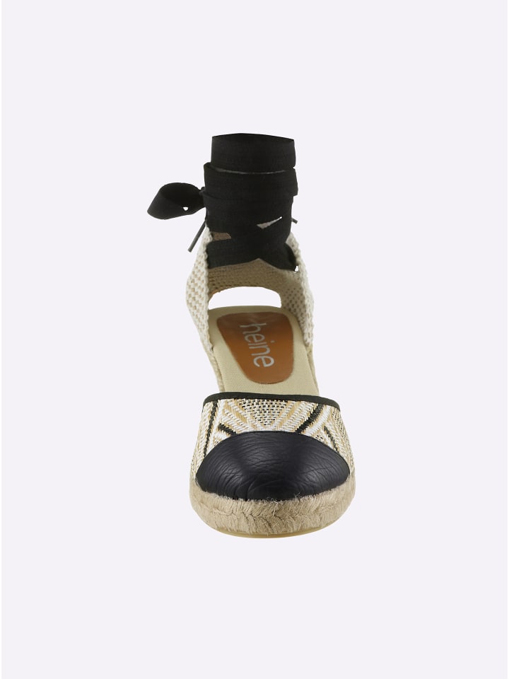 Босоножки на танкетке, произведенные в Испании. Материал: текстиль и синтетика, шнуровка. Подкладка и стелька из текстиля. Высота платформы около 20 мм. Каблук-танкетка, высота около 50 мм, изготовлен из рафии. Прорезиненная подошва.