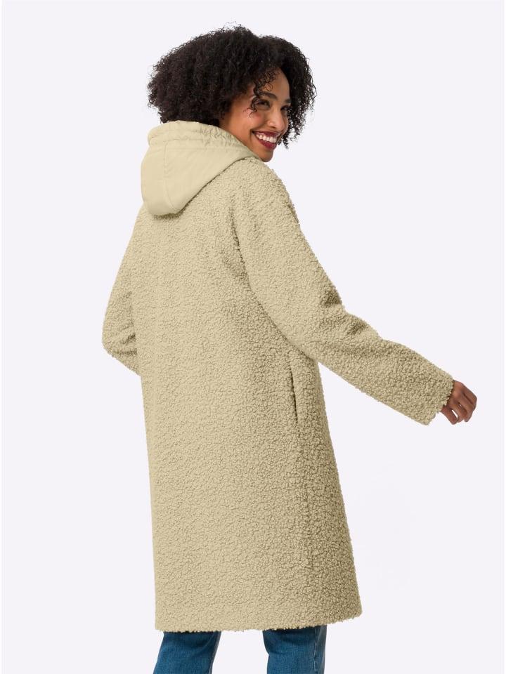 Пальто: Очень красивое и теплое с утеплителем, со съемным стеганым жилетом. Пальто из ткани букле, прямого кроя. Отложной воротник, планка на пуговицах, длинные рукава и карманы. Жилет с пристегивающимся капюшоном и кулиской. Застежка на молнию. Разъем сбоку, регулируемая застежка на пряжках.