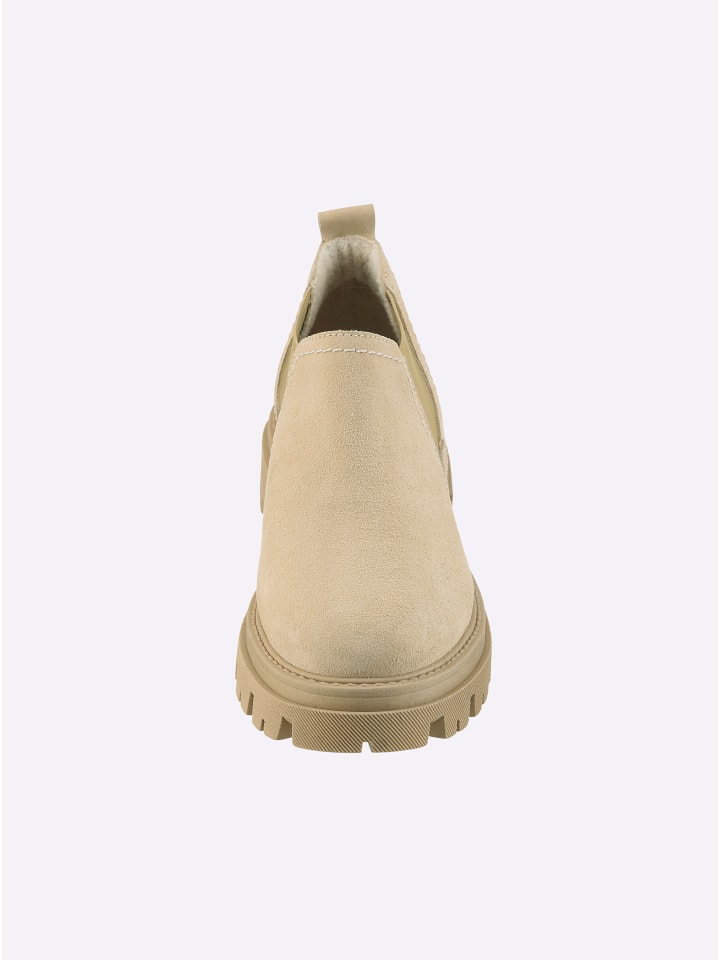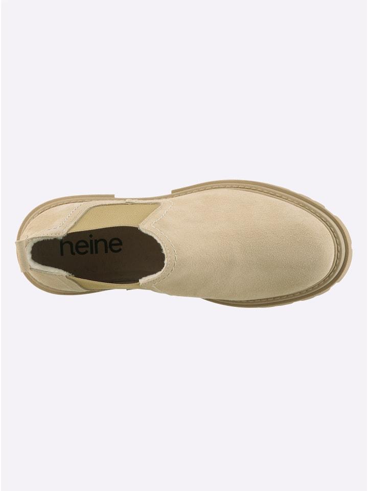 Короткие ботильоны, произведенные в Португалии. Изготовлены из мягкой коровьей замши. С эластичными вставками по бокам и съемной стелькой. Текстильная подкладка. Толщина подошвы около 20 мм. Каблук-бочка, высота около 35 мм.