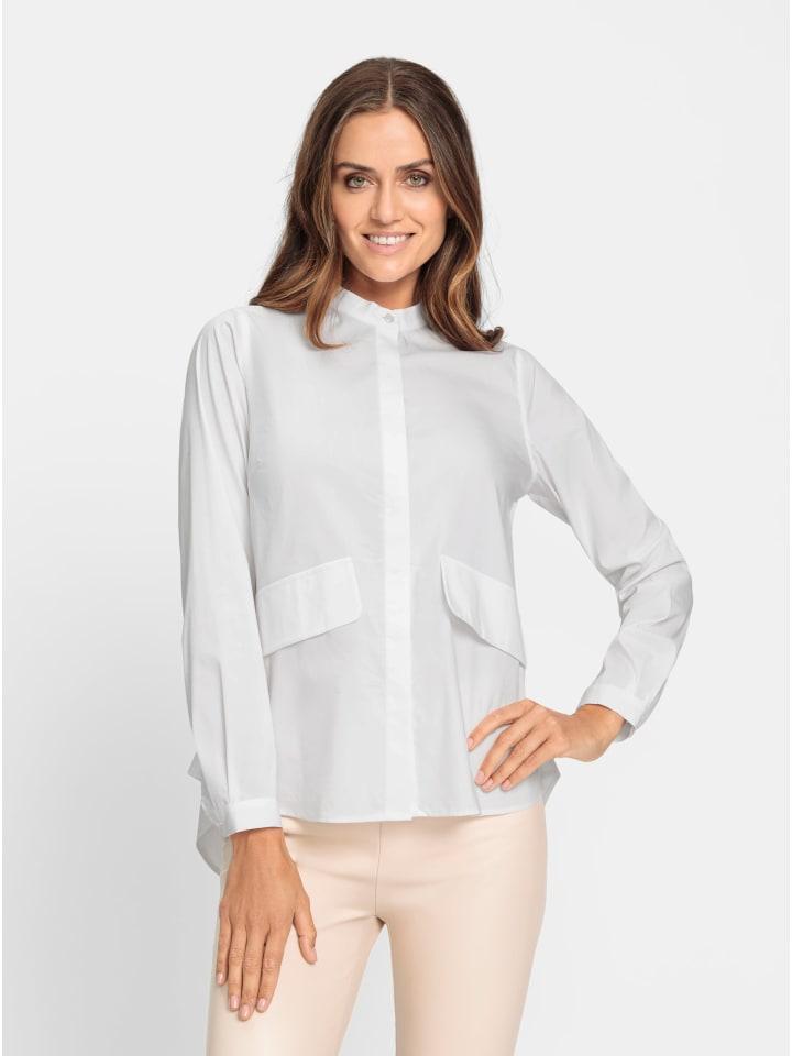 Блузка из эластичной, приятной на ощупь ткани. С небольшим воротником-стойкой, потайной планкой на пуговицах и декоративными карманами с клапанами. Длинные рукава с узкими манжетами на пуговицах. Спинка с кокеткой и складками, слегка удлиненный крой. Соответствует инициативе Сделано в Африке (Collot Made in Africa).