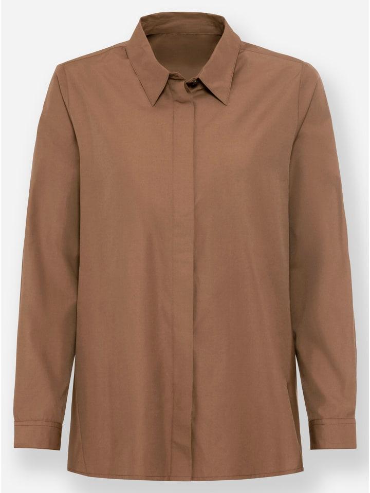 Длинная блузка модного, широкого А-силуэта. С рубашечным воротником, потайной планкой на пуговицах и длинными рукавами с манжетами. Закругленный низ. В соответствии с инициативой Сделано в Африке (Cat. Made in Africa).