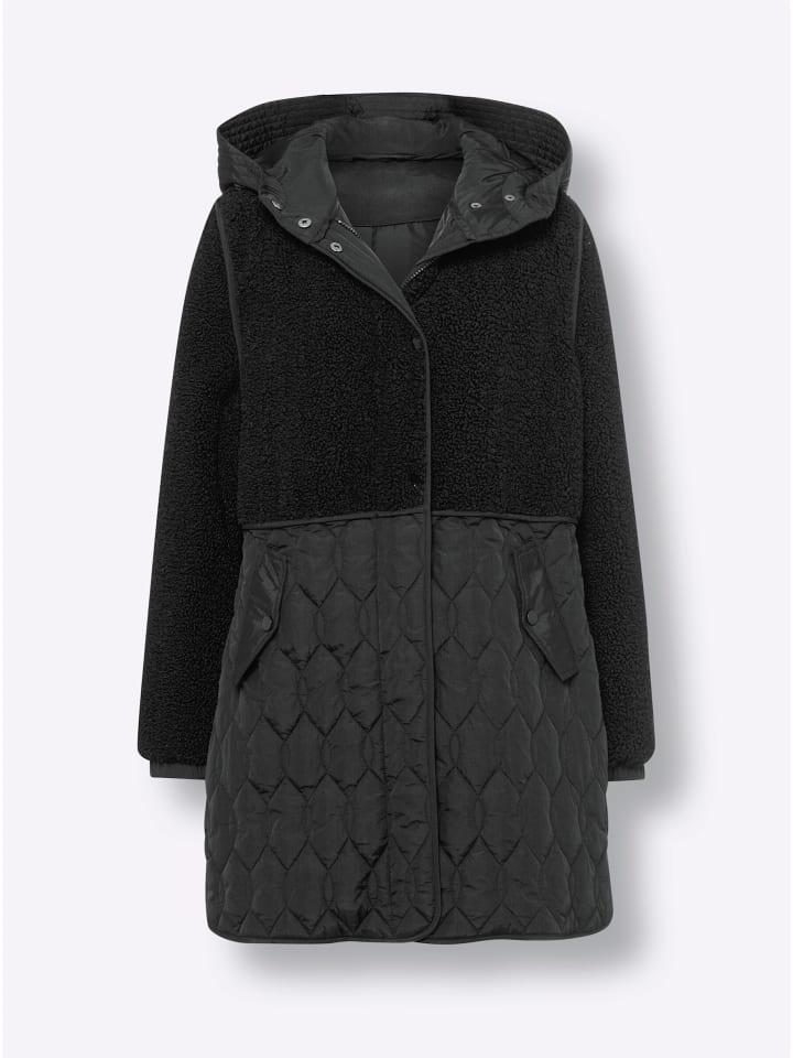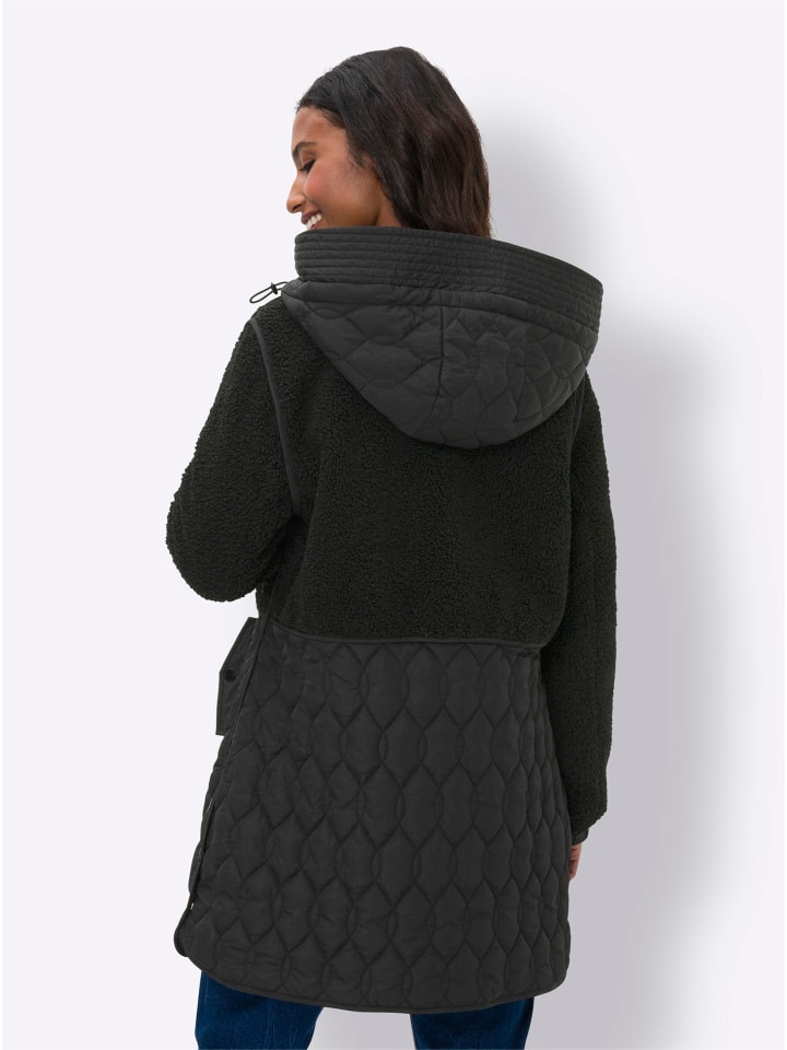 Длинная куртка. Красивая и теплая, из модного микса плюшевого флиса и стеганой ткани. С несъемным капюшоном, длинными рукавами с эластичными манжетами и карманами с клапанами. Застежка на потайную молнию с кнопкой. Боковые разрезы с кнопками.