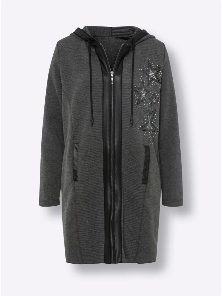 Толстовка в меланжевом цвете, модного удлиненного фасона, с аппликациями в виде звезд и блестящих камней. С капюшоном, застежкой-молнией, боковыми карманами и длинными рукавами.
