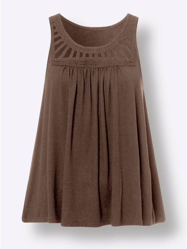 Верх рубашки с эффектной вязаной крючком вставкой на круглом вырезе. Свободный А-силуэт с кокеткой и сборками сзади для более красивой посадки.