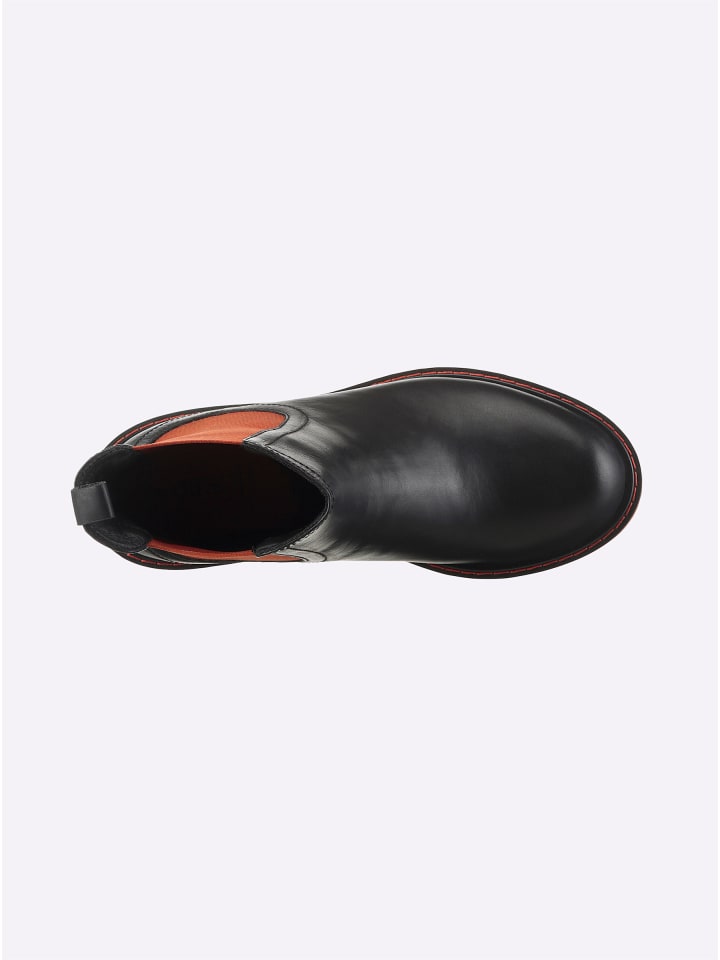 Ботильоны из гладкой коровьей кожи. Легко надеваются благодаря эластичной вставке сбоку. Внутри текстиль. Каблук блочный, высота около 25 мм.