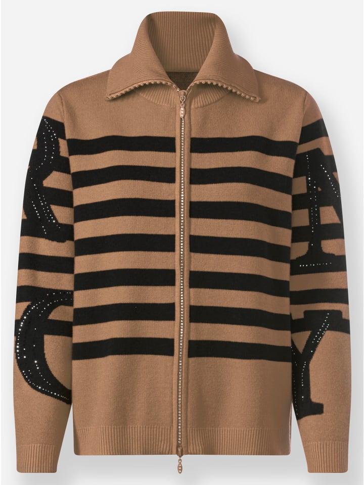Кардиган. Удивительно теплый и мягкий аксессуар с модным рисунком из полосок и букв. Эффектные блестящие камни на двухсторонней молнии. Защитный воротник-стойка. Изготовлен из вискозы ECOVERO от Lenzing.