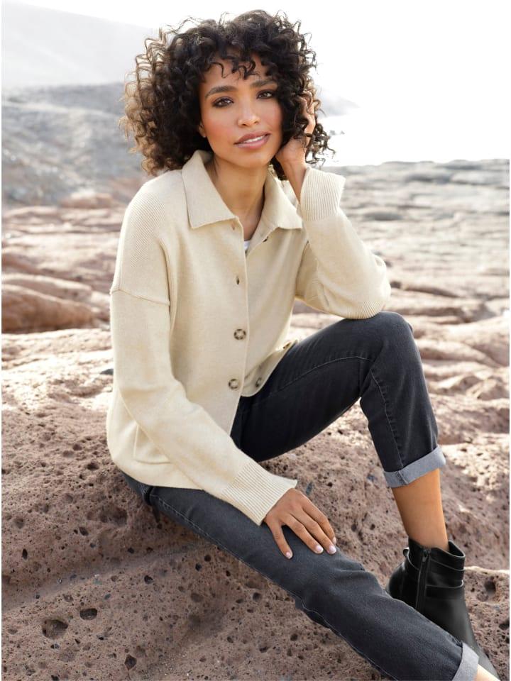 Кардиган из пушистой, мягкой пряжи с добавлением вискозы ECOVERO от Lenzing. Застегивается на пуговицы, с воротником-поло и накладными карманами. Длинные рукава с ребристыми манжетами и разрезом.