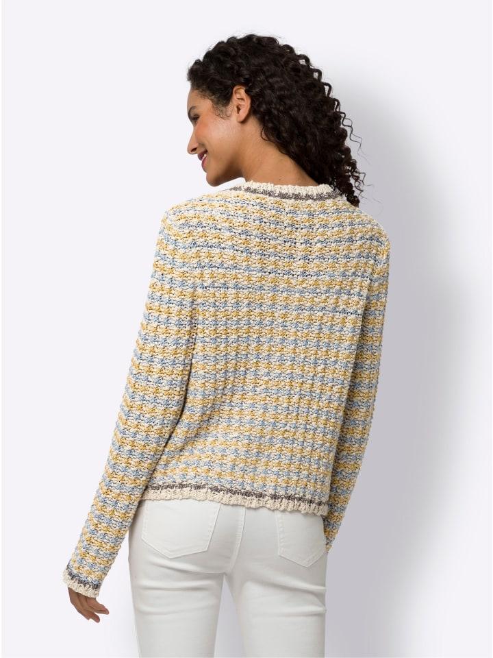 Кардиган из классической, изысканной ткани букле с блестящей пряжей. Круглый вырез горловины с декоративной пуговицей, потайная планка на кнопках. Декоративные карманы с кантом, длинные рукава и узкие манжеты в рубчик.