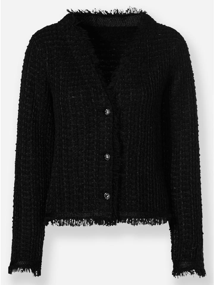 Кардиган с особенно элегантным внешним видом благодаря высококачественной ткани букле. Множество эффектных деталей: модная бахрома по краям, планка с декоративными пуговицами и металлизированные нити. V-образный вырез и длинные рукава.