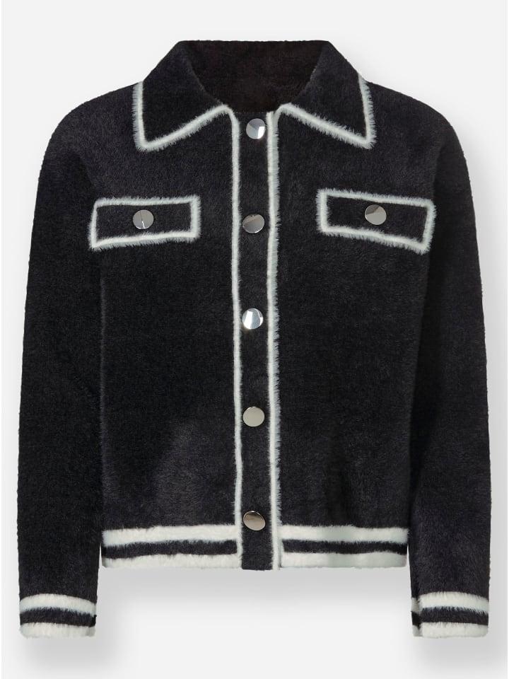 Кардиган в стиле кутюр из пряжи с фантазийными узорами. Яркие контрастные акценты, привлекающие внимание. Модный воротник-поло. С ложными нагрудными карманами и декоративными кнопками. Длинные рукава с разрезом.