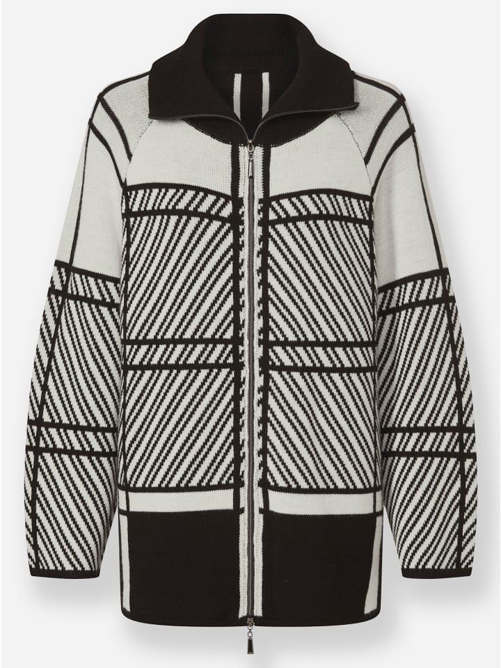 Кардиган из высококачественной жаккардовой пряжи с модным графическим рисунком. Отложной воротник и рукава реглан. Практичная двухсторонняя молния.