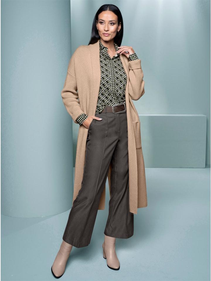 Вязаное пальто: плотный, высококачественный структурированный жаккард с модным открытым передом. С визуально удлиняющим шалевым воротником, карманами и длинными рукавами. Разрез сзади.