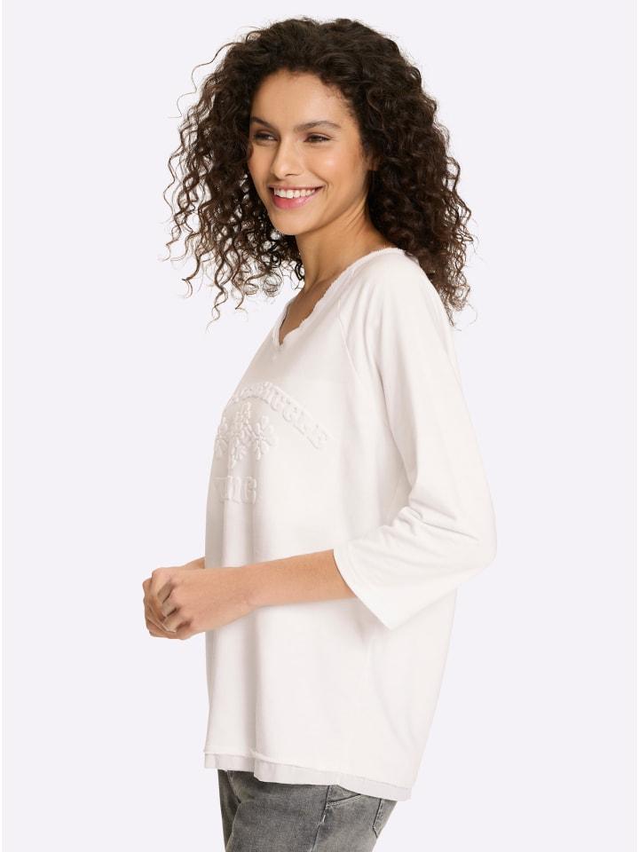 Толстовка из мягкой и комфортной ткани с модной 3D-надписью. V-образный вырез, модные необработанные края и рукава длиной 3/4. Сертифицировано OCS.