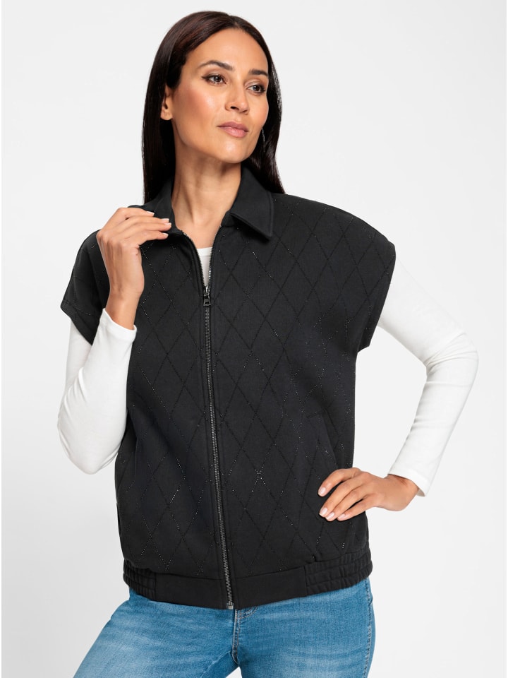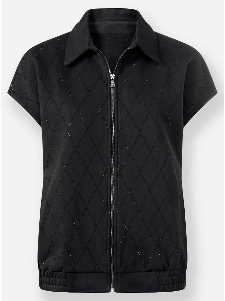 Жилет-свитшот с экстравагантным ромбовидным узором и блестками. Современный рубашечный воротник и модные спущенные плечи. Застежка-молния, боковые карманы и эластичный пояс. Поддерживает инициативу Сделано в Африке (Cat. Made in Africa).