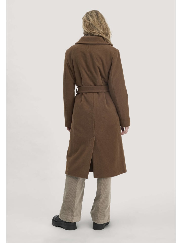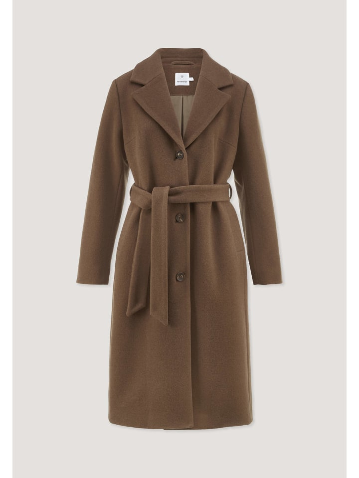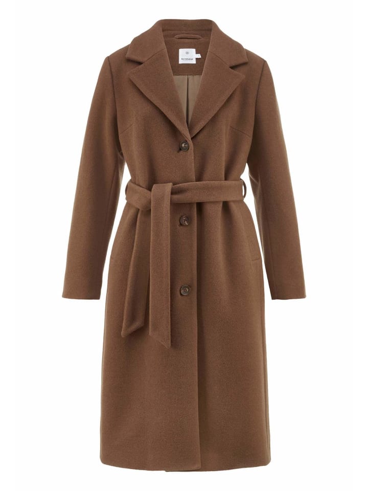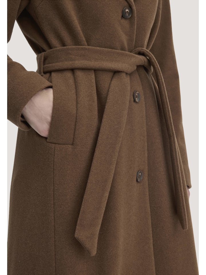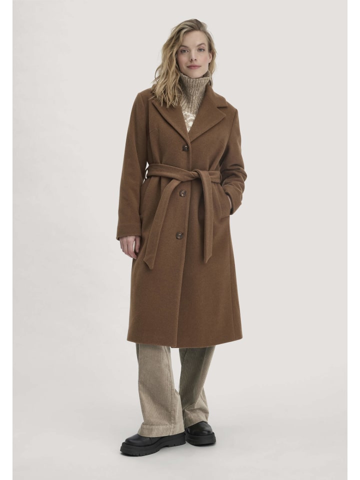 - Пальто с воротником с лацканами, застежкой на три пуговицы и завязывающимся поясом.