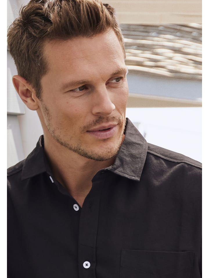 Повседневная рубашка с короткими рукавами от HIS. Классический рубашечный воротник. Нагрудный карман спереди, кокетка сзади. Универсальная базовая модель. Изготовлена из мягкого хлопка.