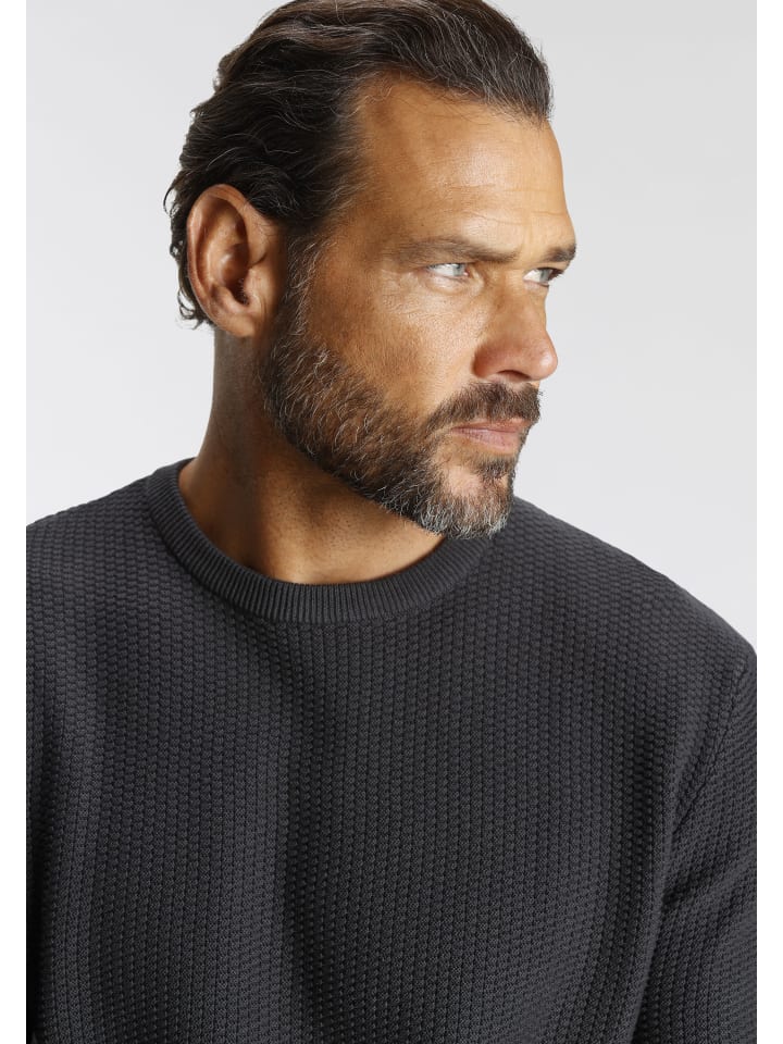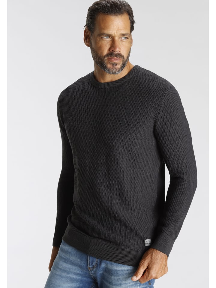 Универсальный мужской свитер с круглым вырезом от HIS. Крой стандартной ширины. Длинные рукава. Модная нашивка. Верх особенно удобен и тепл благодаря качеству вязки.