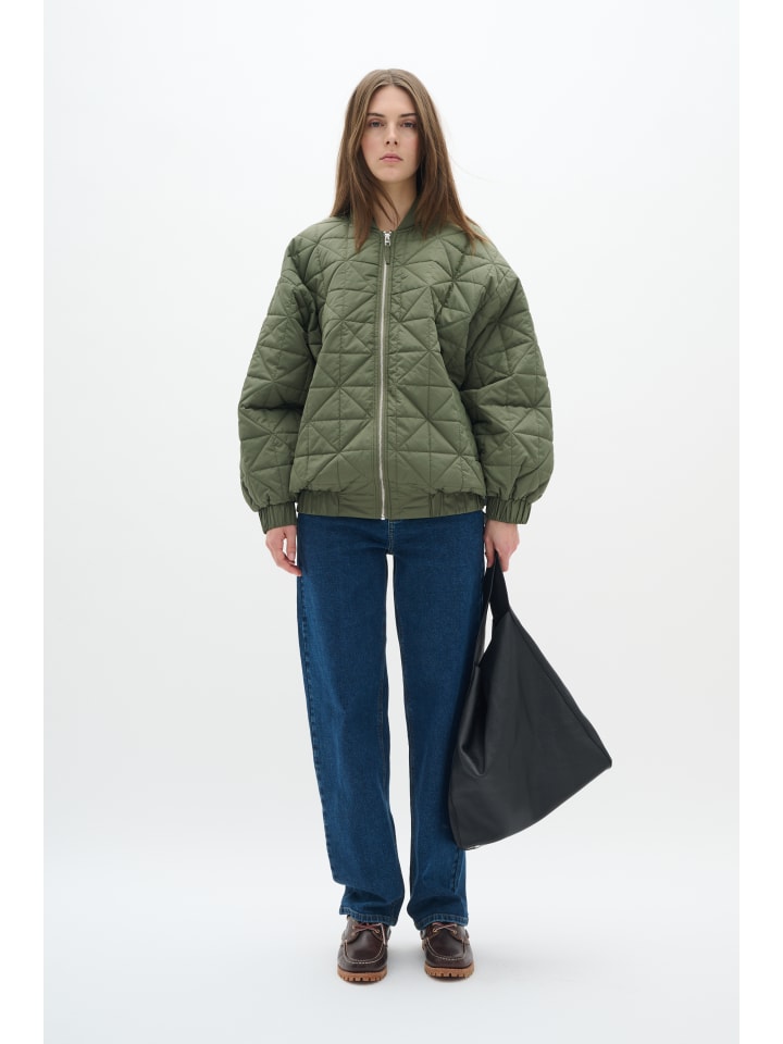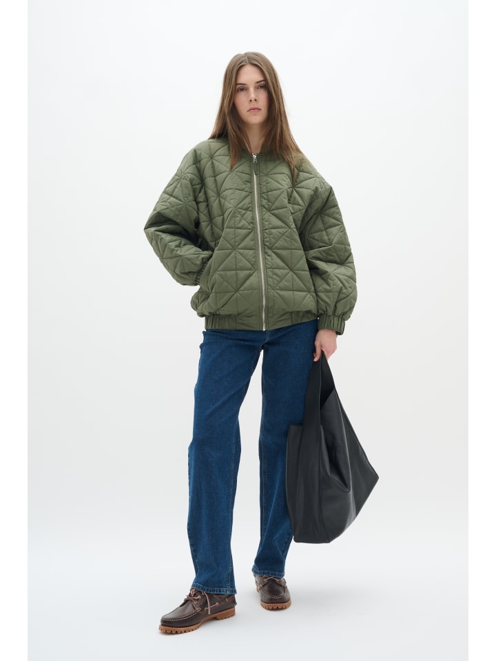 Стеганая куртка с геометрическими швами и свободным, слегка свободным кроем. Воротник-бомбер, молния спереди и боковые карманы дополняют образ.