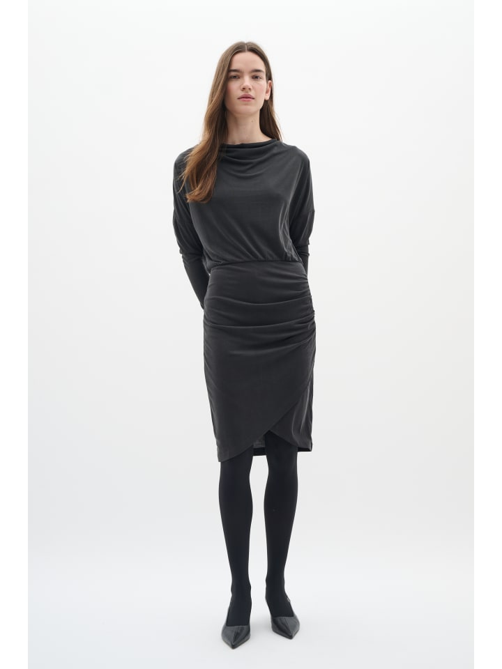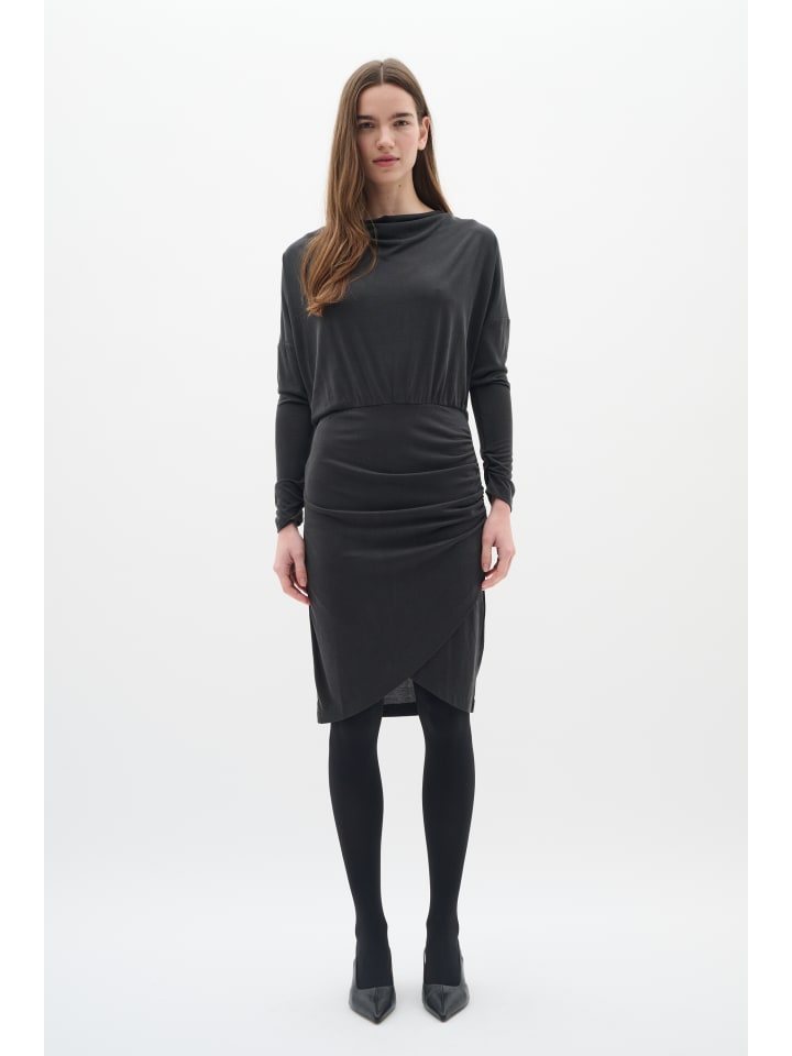 Повседневное платье с драпированным вырезом лодочка, длинными рукавами и прямым кроем. Присборенная талия и юбка-тюльпан внахлест добавляют стиль.