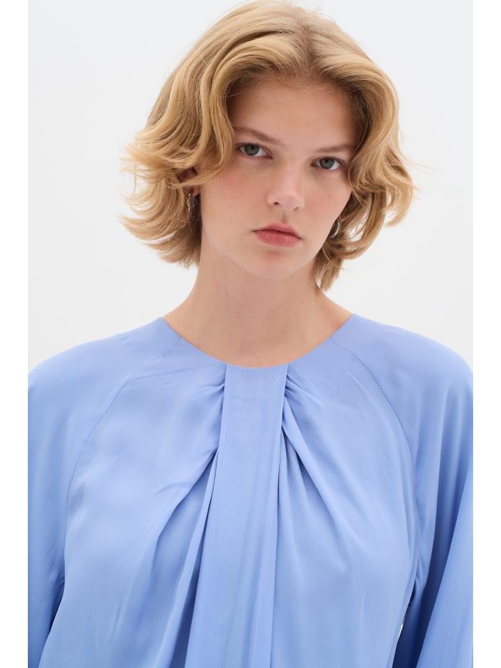 Блузка свободного кроя с круглым вырезом и эффектными складками спереди. Длинные, объемные рукава и гладкая отделка.