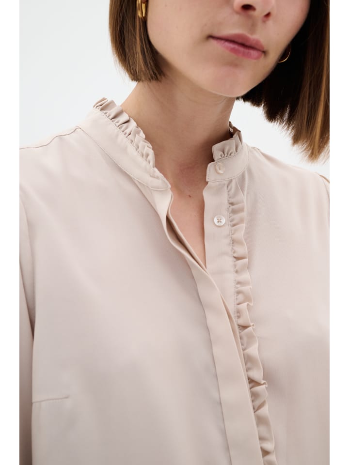 Блузка прямого кроя с высоким воротником с рюшами и потайной планкой на пуговицах с изящной оборкой. Длинные рукава с изящной оборкой. Гладкий вид.