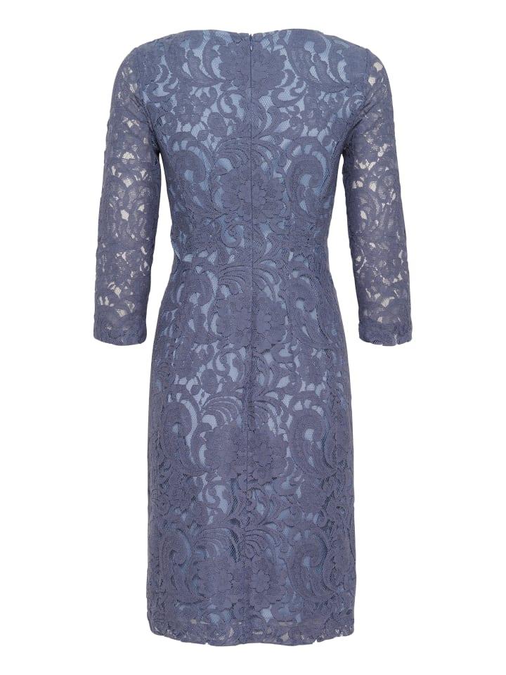 Кружевное платье облегающего кроя, полупрозрачные рукава три четверти, круглый вырез горловины и подол до колена. Полностью видимая структура кружева для современного образа.