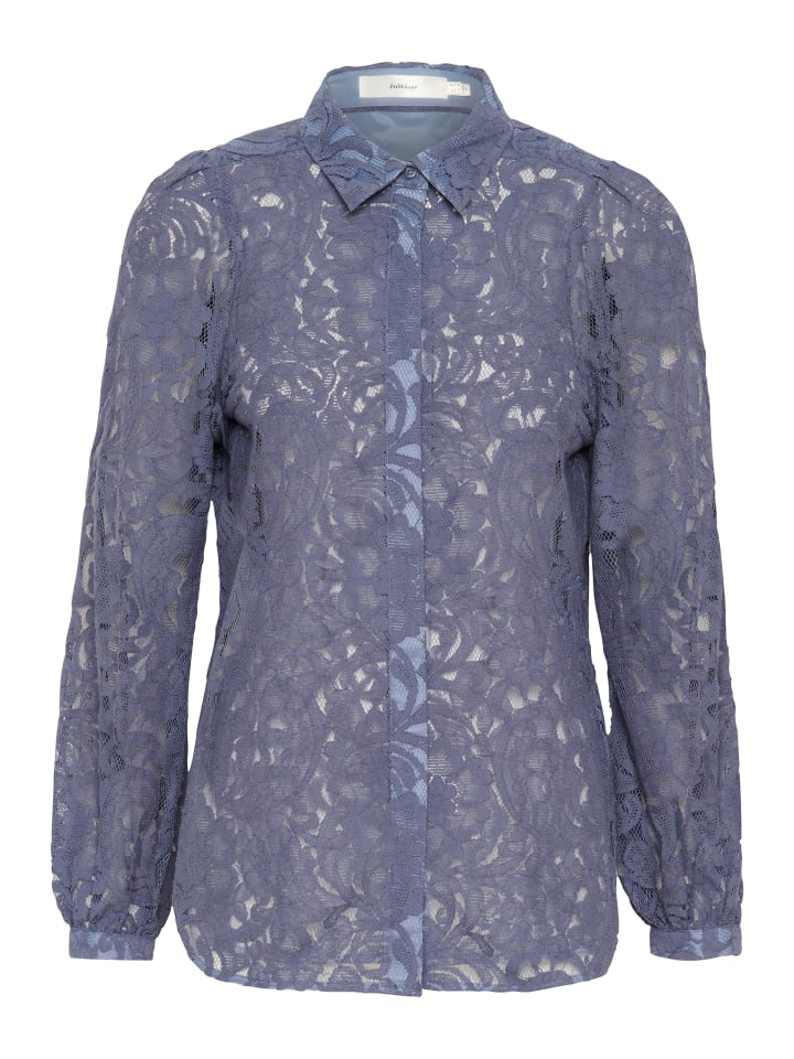 Рубашка из прозрачного кружева с цветочным рисунком, классическим воротником, прямым свободным кроем и длинными, слегка присборенными рукавами.