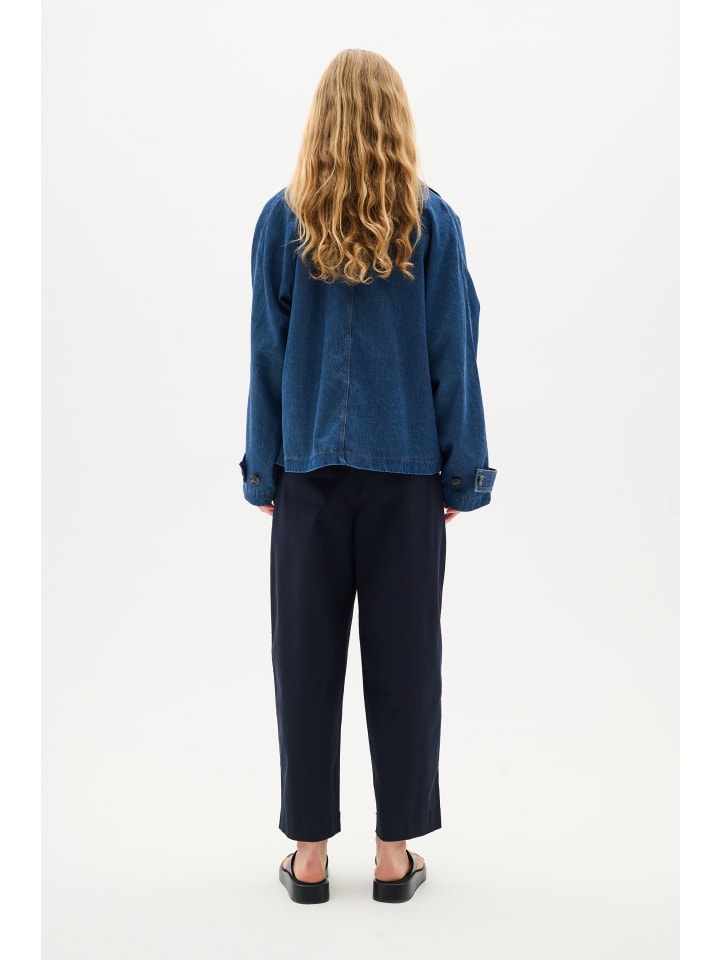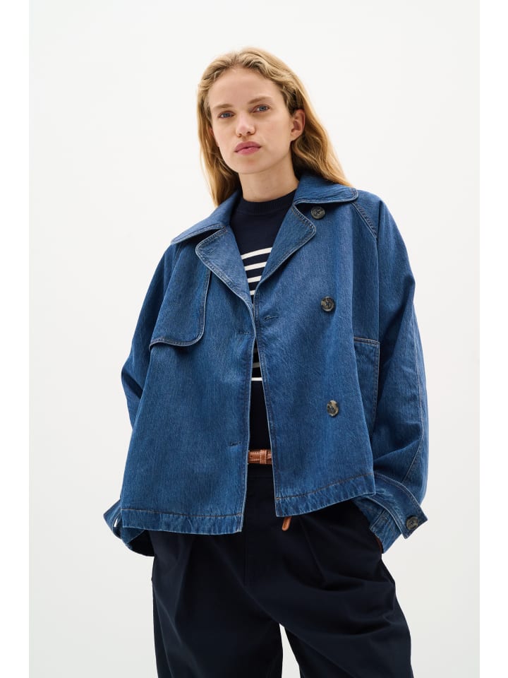 Джинсовая куртка свободного кроя с широким воротником и эффектным передним клапаном. Спущенные плечи и прямой подол дополняют дизайн.