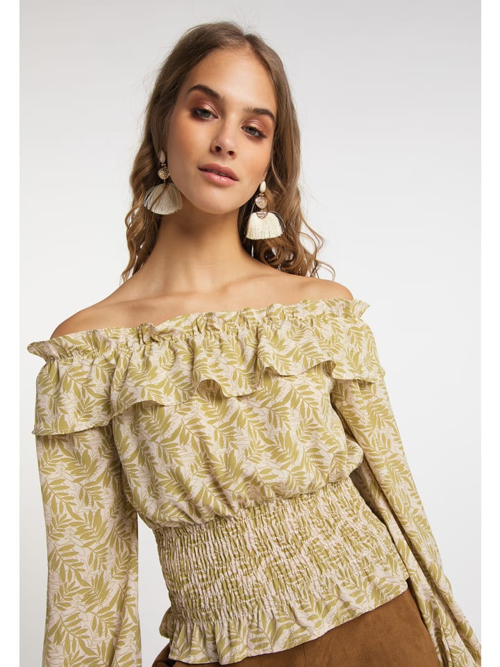 Рубашка Carmen от IZIA впечатляет своим летним цветочным принтом и изысканным кроем с открытыми плечами. Эластичный вырез горловины искусно подчеркивает плечи, а оборка создает эффектный образ. Женственный стиль дополняют широкий присборенный подол и длинные рукава с эластичным поясом. Отлично сочетается с короткими джинсовыми шортами и кроссовками, женственно - с брюками или юбками. Незаменимая вещь для модниц.