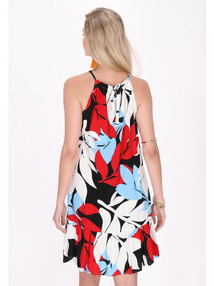 Это платье А-силуэта свободного кроя с круглым вырезом. Без рукавов и изящных бретелей. Низ платья переходит в расклешенный крой с игривой оборкой. Это мини-платье, украшенное тканым цветочным принтом, идеально подходит для повседневных женственных образов. Оно также прекрасно подойдет для мероприятий в стиле бохо. Оно входит в коллекцию Fashion Look.