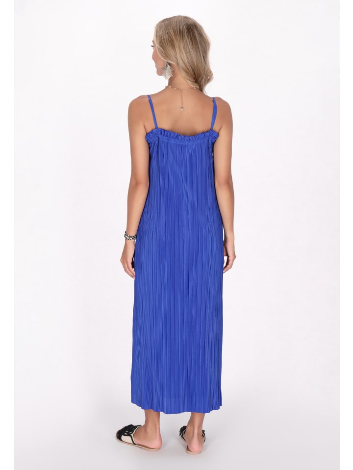 Откройте для себя плиссированное платье, сочетающее свободный крой и макси-длину. Благодаря квадратному вырезу, изящным бретелям и очаровательной оборке, это платье легко впишется в образ в стиле бохо. Изготовленное из мягкого трикотажа, оно воплощает повседневную моду, идеально подходя для комфортных весенне-летних прогулок или ярких фестивальных приключений. Платье входит в весенне-летнюю коллекцию.