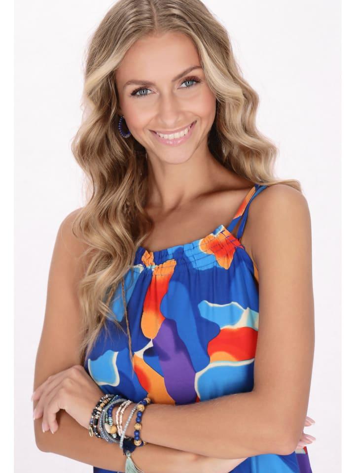 Добавьте изюминку в свой повседневный образ с этим стильным платьем А-силуэта свободного кроя с круглым вырезом. Платье без рукавов оснащено тонкими регулируемыми бретельками, а оборка по низу добавляет игривости. Платье изготовлено из ткани с абстрактным принтом и идеально подходит для повседневных летних прогулок. Оно входит в весенне-летнюю коллекцию.