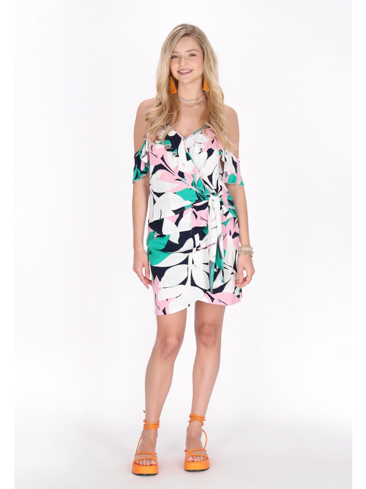 Откройте для себя очарование этого мини-платья-халат с развевающимся силуэтом и короткими рукавами, открывающими плечи. V-образный вырез и лиф с оборками добавляют привлекательности, а облегающий подол обеспечивает комфорт и стиль. Это платье с цветочным узором и многослойными аксессуарами, завязывающееся на талии бантом, идеально подходит для праздников и теплой погоды. Оно входит в коллекцию Fashion Look.