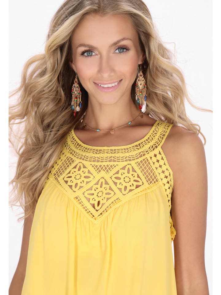 Украсьте свой гардероб этим стильным топом без рукавов, созданным для настоящих ценителей моды. Благодаря вырезу халтер и стандартному крою, он сочетает в себе комфорт и элегантность. Ткань украшена замысловатыми цветочными панелями, связанными крючком, что делает его идеальным вариантом на каждый день. Этот топ из нашей коллекции Boho идеально подходит для повседневных выходов и стильных образов.