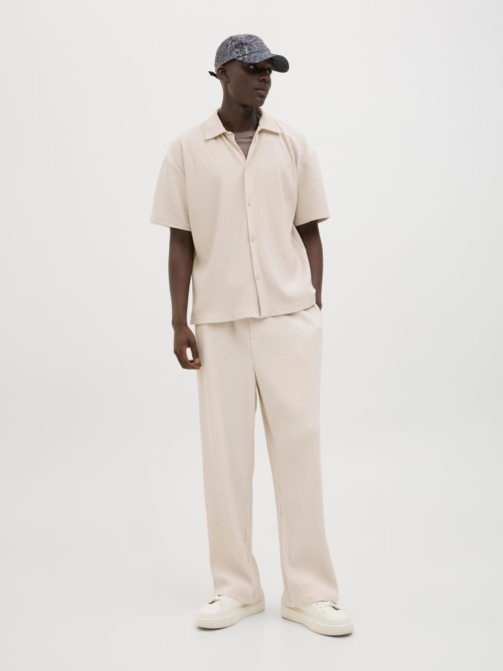 - Покрой: свободный с высокой талией, свободными штанинами и широкими или узкими брючинами с манжетами