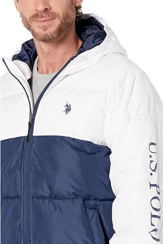 Мужская куртка U.S. Polo Assn. в стильном дизайне с блоками цветов - белым и темно-синим. Изготовлена из высококачественных материалов, обеспечивающих тепло и комфорт в холодные зимние дни. Куртка имеет капюшон. Эта стильная и функциональная куртка станет отличным выбором для зимних прогулок и активного отдыха.