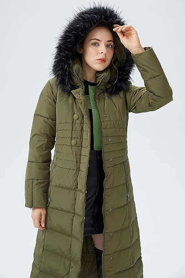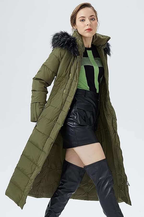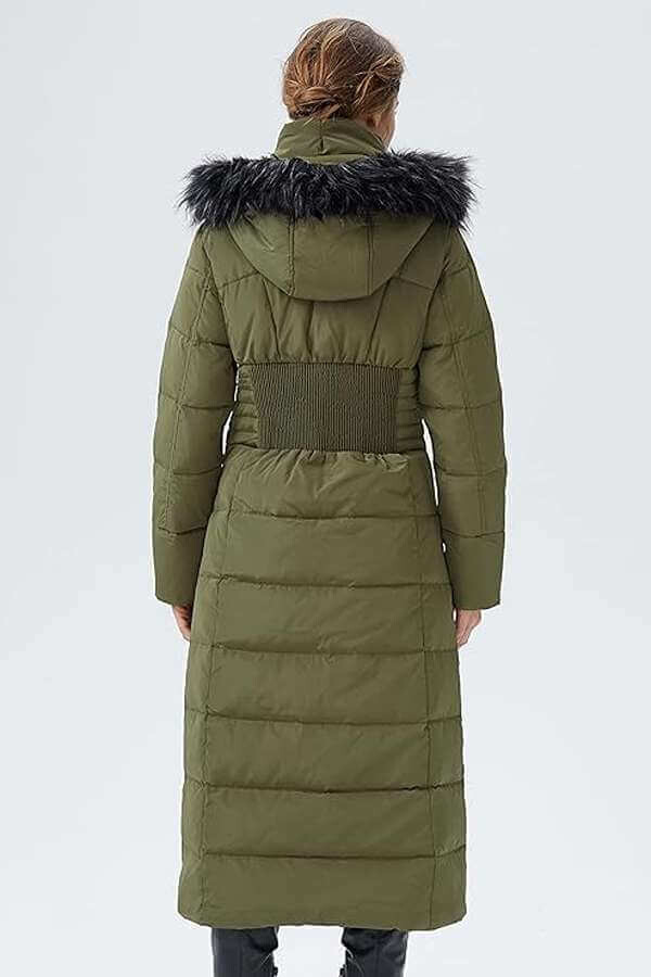 Длинный пуховик А-образного силуэта с двусторонней молнией. Съемный капюшон с отделкой из искусственного меха лучше согреет в непогоду. Эластичный дизайн спины он сохраняет стройность и тепло.