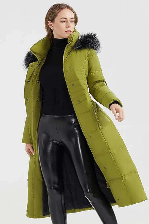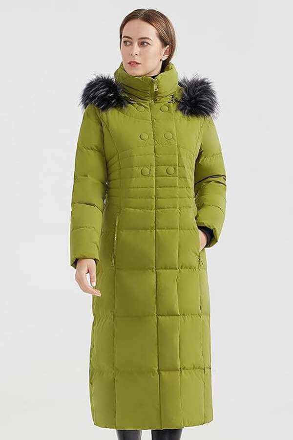 Длинный пуховик А-образного силуэта с двусторонней молнией. Съемный капюшон с отделкой из искусственного меха лучше согреет в непогоду. Эластичный дизайн спины он сохраняет стройность и тепло.