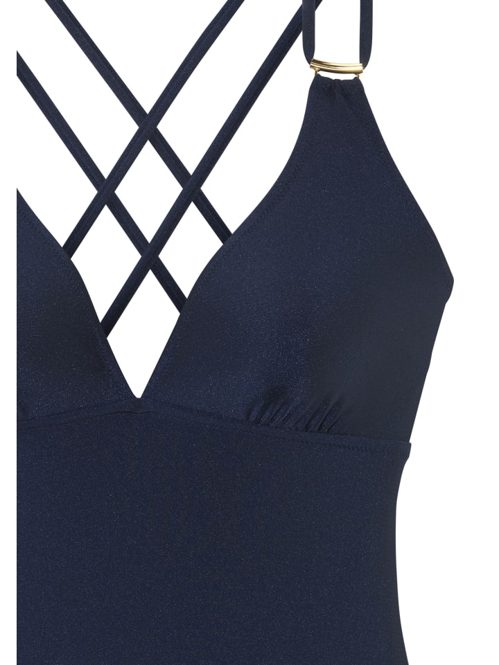 Купальник от Jette, созданный дизайнером Джетте Юп, с элегантными золотистыми украшениями. Чашечки съемные. Бретельки регулируются и перекрещиваются на спине. Классический крой. Материал с легким блеском.