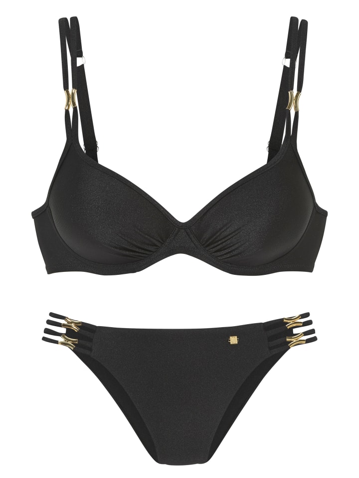 Бикини на косточках от Jette, созданное дизайнером Джетте Юп, с элегантными золотистыми украшениями. Формирующие чашечки с подушечками. Регулируемые бретельки. Плавки бикини с завязками по бокам. Классический крой. Слегка блестящий материал.